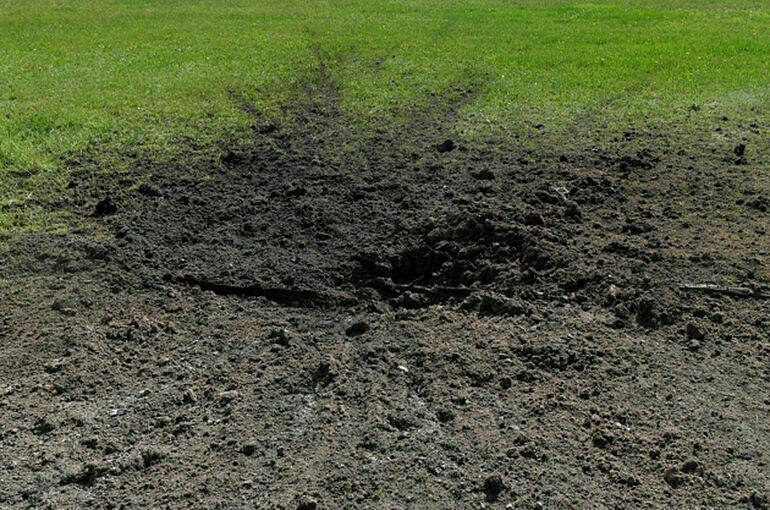В результате взрыва образовалась воронка и загорелась трава. Повреждений нет, никто не пострадал.