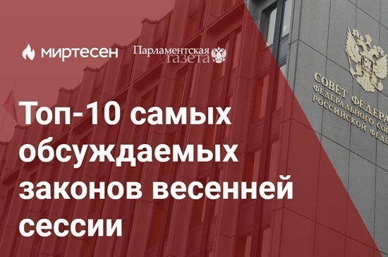 Официальное издание Федерального Собрания «Парламентская газета» совместно с социальной медиаплатформой «Миртесен» составили Топ-10 самых обсуждаемых законов весенней сессии 2019 года. Рейтинг был составлен на основе анализа контента и комментариев пользователей на платформе.