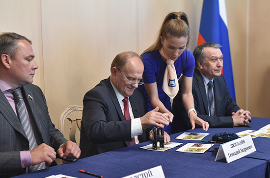 Геннадий Зюганов гасит почтовую марку. Фото: ПГ/Игорь Самохвалов