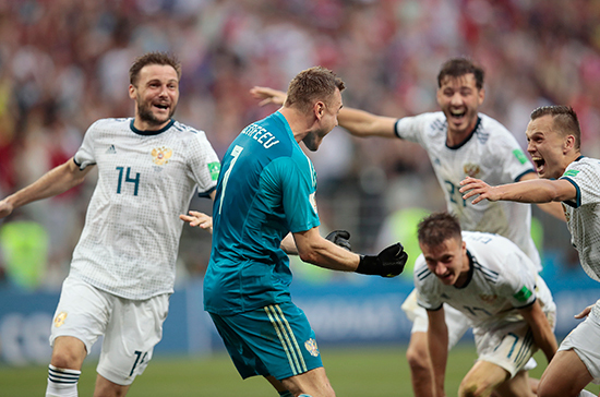 Бразильцы, если я не ошибаюсь, играть в хоккей так и не начали, а вот сборная России уже сенсационно пробилась в четвертьфинал мирового футбольного первенства и готовится сразиться за выход в полуфинал с командой Хорватии.