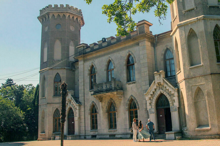 «Дворец в Гаспре был построен в конце 1820-х годов для министра народного просвещения князя Александра Голицына в стиле английского замка, князь подражал графу Михаилу Воронцову и его знаменитому Алупкинскому дворцу. Графине Софье Паниной дворец достался в конце XIX века. Лев Толстой жил здесь с сентября 1901-го по июль 1902 года, проходя лечение и одновременно работая над повестью «Хаджи-Мурат». В гости к нему приезжали Антон Чехов, Максим Горький, Александр Куприн, Федор Шаляпин», — рассказал Сергей Курьянов.