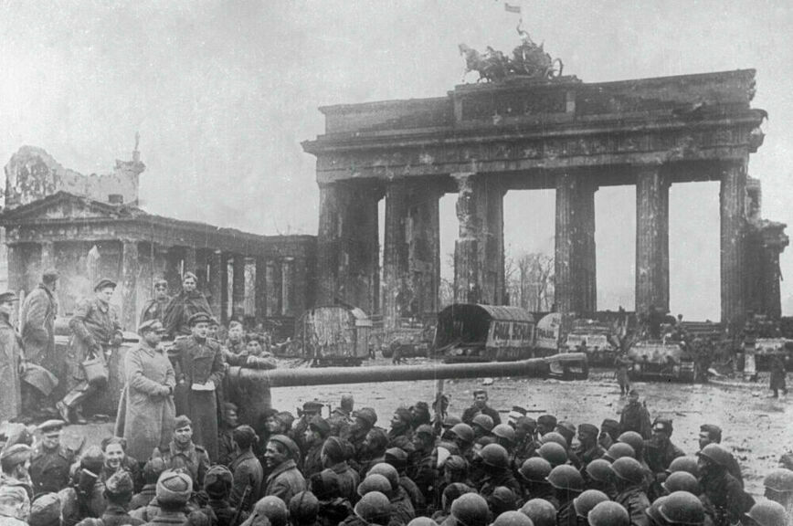 Кстати, войну Долматовский закончил в Берлине. Однажды в разгромленной рейхсканцелярии поэт нашел металлическую голову Гитлера, отвалившуюся от какой-то статуи или бюста. Взяв трофей под мышку, он вышел в город и сфотографировался с поверженным фюрером у Бранденбургских ворот. Там же 2 мая поэт читал свои стихи перед советскими бойцами. Победителями фашизма.