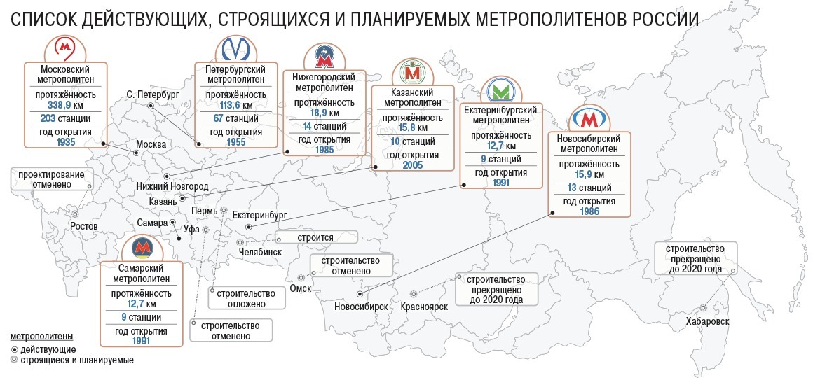 Подземки функционируют в семи городах России: Москве, Санкт-Петербурге, Нижнем Новгороде, Новосибирске, Екатеринбурге, Самаре и Казани. Ежегодно они перевозят 3,3 миллиарда пассажиров, но нормативной базы для такого транспорта на уровне федерального закона до сих пор нет.