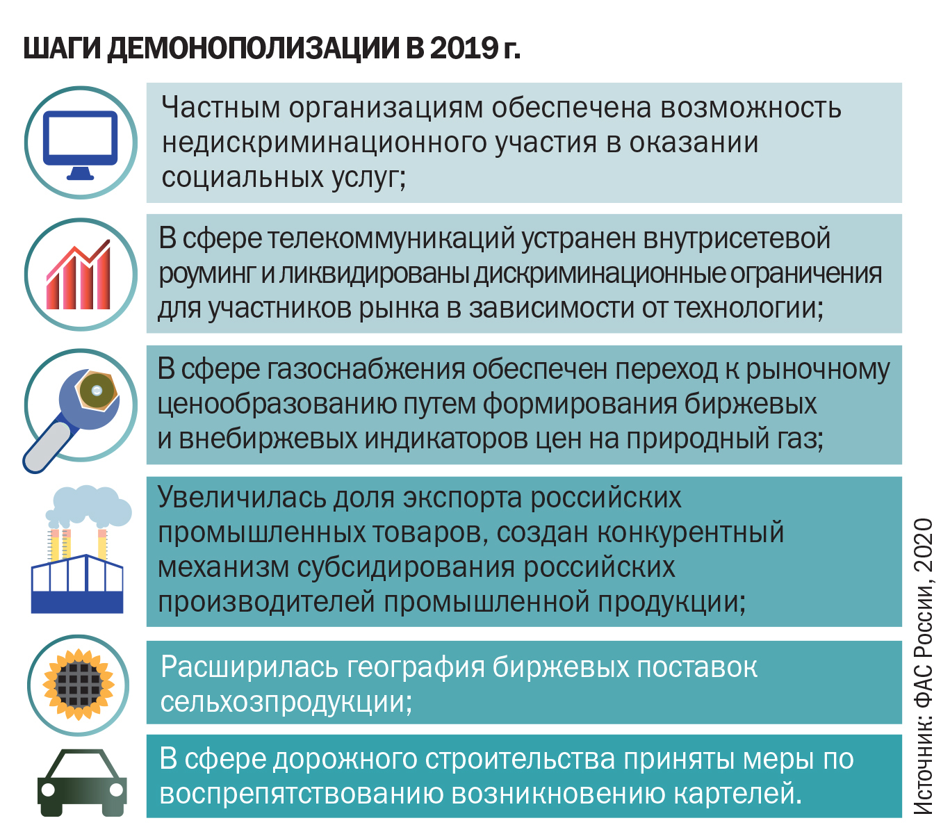 Все органы власти — от федеральных до муниципальных — получили задания. Все 85 субъектов РФ выработали планы мероприятий («дорожные карты»). В них обозначены как системные меры по улучшению конкурентной среды в регионе (поддержка малого предпринимательства, совершенствование закупочной деятельности, процессов управления госимуществом, упрощение доступа к финансовым ресурсам), так и мероприятия по увеличению доли частного сектора на выбранных регионом товарных рынках. Уже есть результаты. Во всех отраслях экономики, исключая сферы деятельности субъектов естественных монополий и организаций ОПК, присутствует не менее трех хозсубъектов, причем как минимум один из частного бизнеса. По сравнению с 2017 годом в 1,3 раза сократилось количество нарушений антимонопольного законодательства со стороны органов власти.