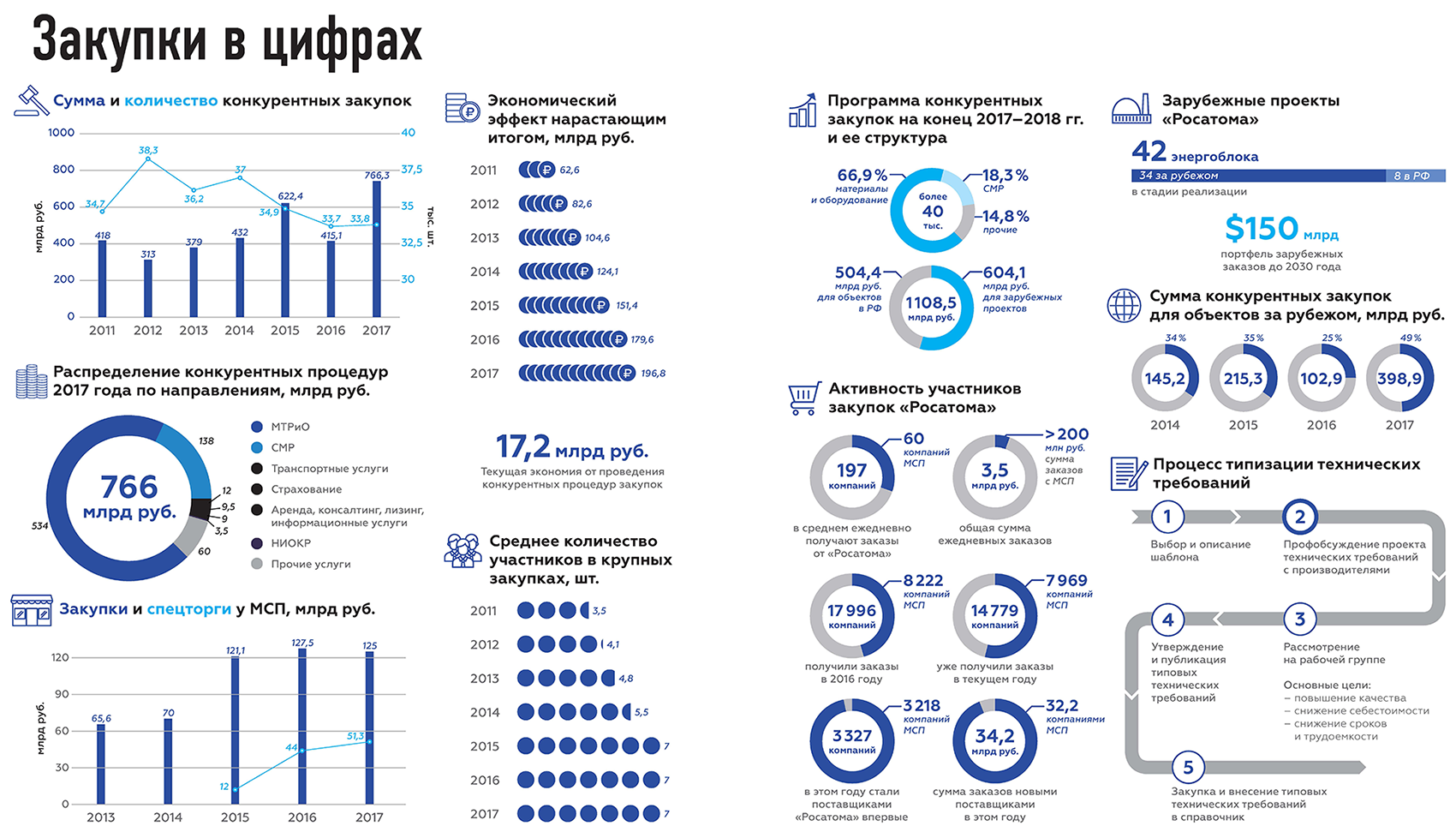 С конца текущего года и до конца 2018 года Госкорпорация «Росатом» планирует осуществить свыше 40 тысяч конкурентных закупок продукции и услуг для своих проектов на общую сумму 1,1 триллиона рублей, сообщил директор по закупкам Росатома Роман Зимонас. Из этой суммы объём закупок для международных проектов Росатома составит 604,1 миллиарда рублей, для объектов в РФ — 504,4 миллиарда рублей. Из общей суммы 1,108 триллиона рублей 741,7 миллиарда пойдёт на закупку материалов и оборудования, 202,9 миллиарда рублей - на строительно-монтажные работы.