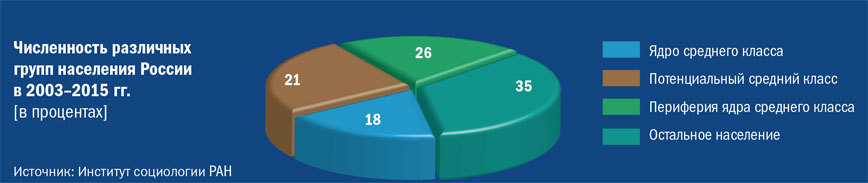 Сейчас со средним классом происходят вещи печальные, но пока не драматичные. Слухи о его исчезновении преувеличены, так же как и сообщения в некоторых СМИ о том, что доля среднего класса в структуре населения снизилась вдвое и ныне составляет 20 с небольшим процентов населения. Это не так. Согласно критериям Всемирного банка, маркером определения среднего класса является уровень доходов от 10 до 50 долларов в день по паритету покупательной способности национальной валюты к доллару. По российским меркам, с учетом нынешнего рыночного курса примерный диапазон равен 7-35 долларов на человека. У более чем 40 процентов россиян именно такой доход, и их можно квалифицированно считать средним классом.