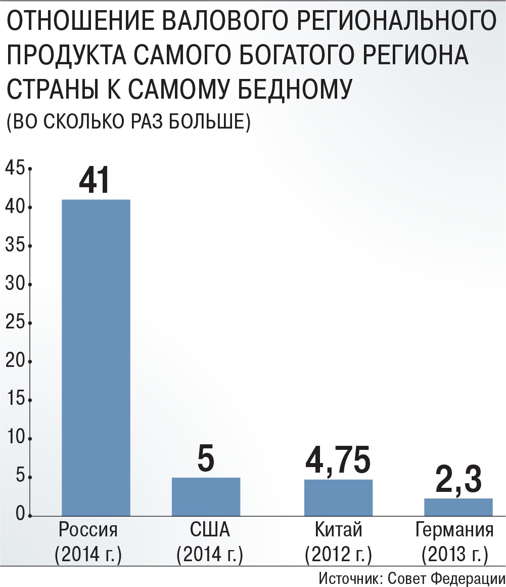 Сегодня уровень развития субъектов федерации крайне неоднородный, и, если в Москве или Ханты-Мансийске близки к приемлемым стандартам, то в Назрани или Саранске – нет. Социальные расходы на душу населения, к примеру, в Дагестане составляют 22,8 тысячи рублей, а в Ненецком автономном округе – 252, 5 тысяч рублей, разница более чем десятикратная! Но и разница в валовом региональном продукте на душу населения громадная: ВРП самого бедного региона ниже в 41 раз ВРП наиболее состоятельного субъекта. А общие доходы пяти самых богатых регионов превышают доходы пяти самых бедных в 43 раза!