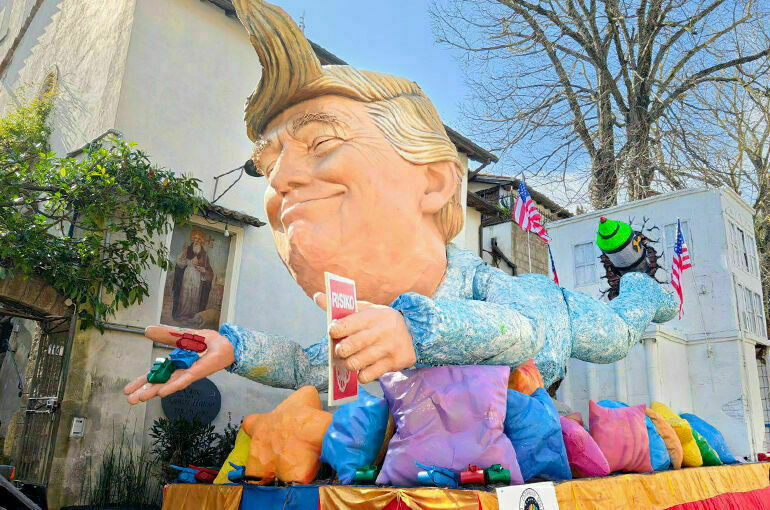 Особыми участниками карнавала являются передвижные платформы, которые тянут с собой колонки с музыкой. И если у одних групп это просто пикапы с прицепом, то самые творческие коллективы придумывают целые композиции с движущимися руками и головами. Одной из мощнейших «повозок» в этом году стал огромный гриф высотой в небольшой дом, который угрожающе раскрывал пасть, словно пытаясь полакомиться гостями карнавала. Не обошлось и без политики: итальянцы изобразили на одной из платформ огромного Дональда Трампа, предлагающего всем щедрой рукой оружие, еще на одной платформе в аллегорической форме изобразили ситуацию в НАТО, где «кот» в звездно-полосатой одеждой был окружен «мышами» (на каждой — галстук цвета одного из европейских флагов), сидящими на куске сыра в мышеловке.