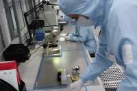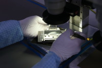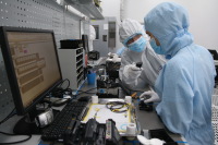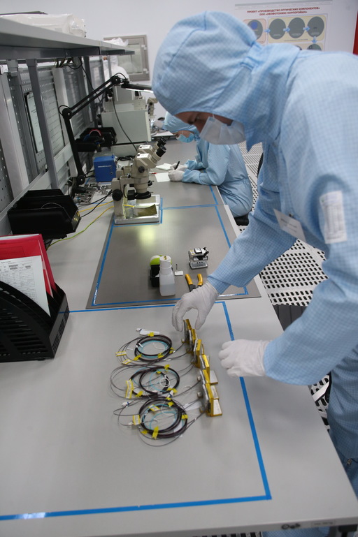 А вот персонал, работающий здесь, одет в костюмы голубого цвета. Всю смену сотрудники вынуждены работать в них, — здесь нет места для пыли, работа идёт с тонкой, крайне чувствительной оптоволоконной нитью. В производственном помещении происходит формирование оптических каналов на кварцевых пластинах, их резка на отдельные чипы, полировка, чистка, упаковка и тестирование.Оператор Иван Сергеев рассказывает мне о своей работе, употребляя много непонятных для непосвященных слов.