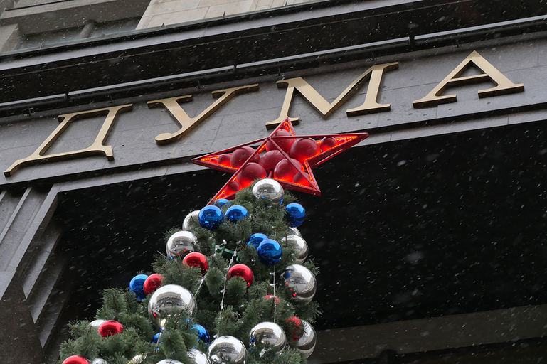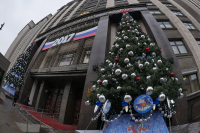 Государственную Думу украсили к Новому году ещё за несколько недель перед праздником. Сначала две большие ёлки поставили перед старым зданием Госдумы на Охотном ряду, затем «новогодние красавицы», украшенные золотыми и красными шарами, появились на первых этажах старого и нового здания. Каждая фракция постаралась и украсила свои приёмные. Особенно постарались коммунисты, которые развесили в фойе винтажные новогодние игрушки, а рядом с приёмной первого вице-спикера Ивана Мельникова поставили красный рояль. В думском буфете по традиции продаются картонные «Кремли» с конфетами, и начинённые сладостями разноцветные петухи. Гости Госдумы могут купить в подарок сувениры с государственной символикой: календари, ручки, вазы, подстаканники с гербом.