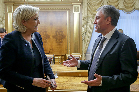 «Мы знаем, что вы последовательный сторонник развития российско-французских отношений и ценим вашу исключительно взвешенную позицию по самым острым вопросам европейской повестки дня», — обратился Слуцкий к Ле Пен на заседании комитета. — Взаимоотношения России и Франции во многом зависят от того, как наши парламенты будут взаимодействовать в сфере борьбы с терроризмом и в построении стабильной европейской архитектуры», — отметил Леонид Слуцкий.