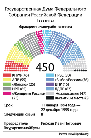 В нижнюю палату были избраны 444 депутата (225 — по общефедеральному избирательному округу, 219 - по одномандатным округам). В пяти округах выборы по разным причинам не состоялись, в одном (Чечне) не проводились. Восемь из 13 избирательных объединений (блоков) преодолели пятипроцентный барьер: первое место - Либерально-демократическая партия России (64 мандата), далее - «Выбор России» (64), КПРФ (42), «Женщины России» (23), Аграрная партия России (37), «Яблоко» (27), Партия российского единства и согласия (22), Демократическая партия России (14). Кстати, первое место было отдано ЛДПР из-за большего числа полученных голосов избирателей: 22,92 процента против 20,51 у «Выбора России»… В результате того, что ни одна из партий не завоевала конституционного большинства, первая Госдума отличалась неустойчивостью, причём даже состав фракций постоянно изменялся.