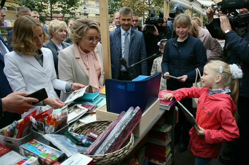 Накрапывавший питерский дождик не мешал детям и их родителям перебирать книжки и тетради на Книжных аллеях, развернувшихся в двух шагах от Невского проспекта, на Малой Конюшенной улице. К девочке, державшей в руках издание, на яркой обложке которого значилось «Научные опыты», внезапно подошла Валентина Матвиенко. «Ты в какой класс пойдёшь? — спросила она. «В первый», — ответила малышка. «Думаю, ты будешь круглой отличницей», — рассмеялась спикер СовФеда.