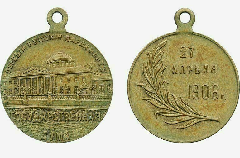 Первая Государственная Дума начала работать 27 апреля 1906 года в Санкт-Петербурге. Тогда и родилась идея выдавать депутатам отличительные знаки — позолоченные жетоны с изображением Таврического дворца. В верхней части аверса было написано «Первый русский парламент», в нижней — «Государственная Дума», а на реверсе была дата «27 апреля 1906 года» и лавровый венок.