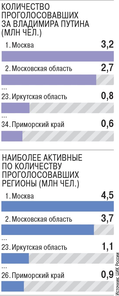 По числу проголосовавших Иркутская область заняла 23-е место по стране и такое же место — по голосам, отданным за Владимира Путина.