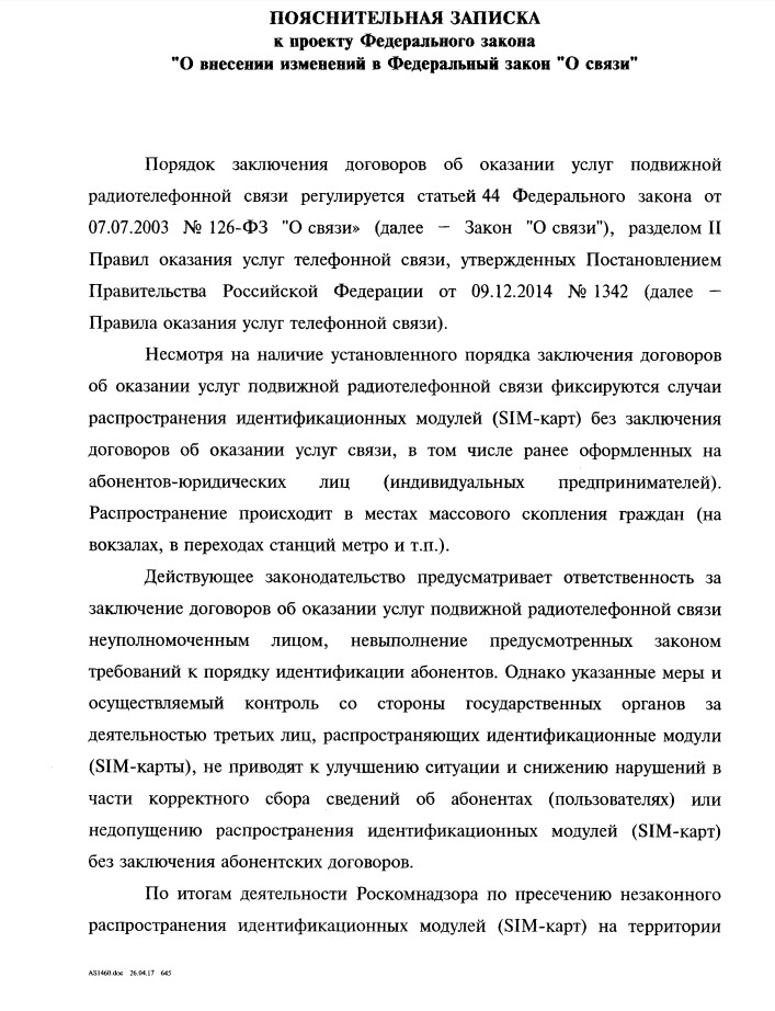 «Необходимость внесения изменений в законодательство вызвана неудовлетворительной ситуацией со сбором данных абонентов — пользователей сотовой связи. Несмотря на то, что порядок оказания услуг мобильной связи установлен на законодательном уровне, фиксируются многочисленные случаи распространения SIM-карт без заключения договоров. Так, в ходе совместных действий Роскомнадзора и МВД РФ в 2016 году изъято 28 516 незаконно выданных SIM-карт",- пояснила один из авторов законопроекта, заместитель председателя Комитета Совета Федерации по конституционному законодательству и государственному строительству Людмила Бокова.