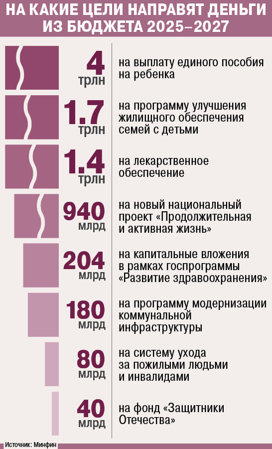 - Все обязательства, даже с учетом новых инициатив президента, которые он озвучил в рамках Послания Федеральному Собранию в текущем году, запланированы к финансированию и на следующий год, и на ближайшие три года, и даже с перспективой на шестилетку. На эти цели планируется выделить порядка семи триллионов рублей в 2025-2027 годах — это тот объем средств, который полностью покрывает запланированные социальные цели. Это касается, например, обязательств в поддержке семей по жилищному строительству. Так, для компенсации первоначального взноса на приобретение жилья льготными категориями граждан планируется выделить 1,7 триллиона рублей — это подразумевает, что все семьи, которые подпадают под эту категорию, смогут воспользоваться такой поддержкой от государства.