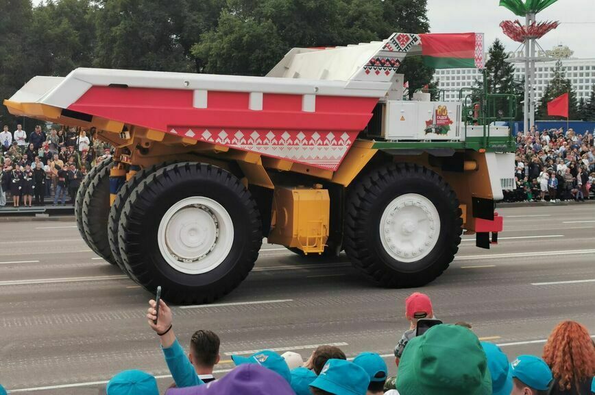 После завершения военной части по площади проехала белорусская техника мирного времени — самосвалы БелАЗ, грузовики МАЗ, автобусы, комбайны и тракторы, прошли колонны от предприятий и активисты.
