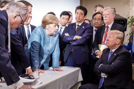 Ранее в интернете появилась фотография, на которой канцлер Германии Ангела Меркель строго смотрит на американского президента Дональда Трампа, который сидит за столом, скрестив руки. При этом рядом с Меркель стоят лидеры европейских стран, а между ней и президентом США — премьер-министр Японии Синдзо Абэ.
