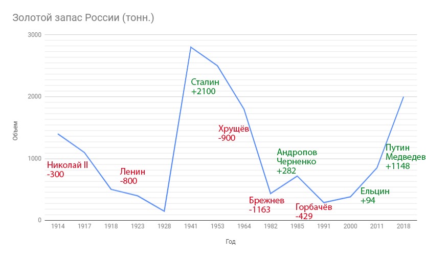 Графические фигуры, изображающие размер золотого запаса России в ХХ веке, крайне показательны и, более того, поучительны. К началу Первой мировой войны он составлял, достигнув исторического пика, почти полторы тысячи тонн. Много золота ушло на закупку вооружений, 90 тонн было выплачено Германии по Брестскому миру, ещё больше украдено (вспомним «золотые эшелоны» на перекрёстках тогдашней бурной истории). К концу гражданской войны запас снизился по непроверенным данным до 400 тонн, а борьба с послевоенной разрухой ополовинила и это.