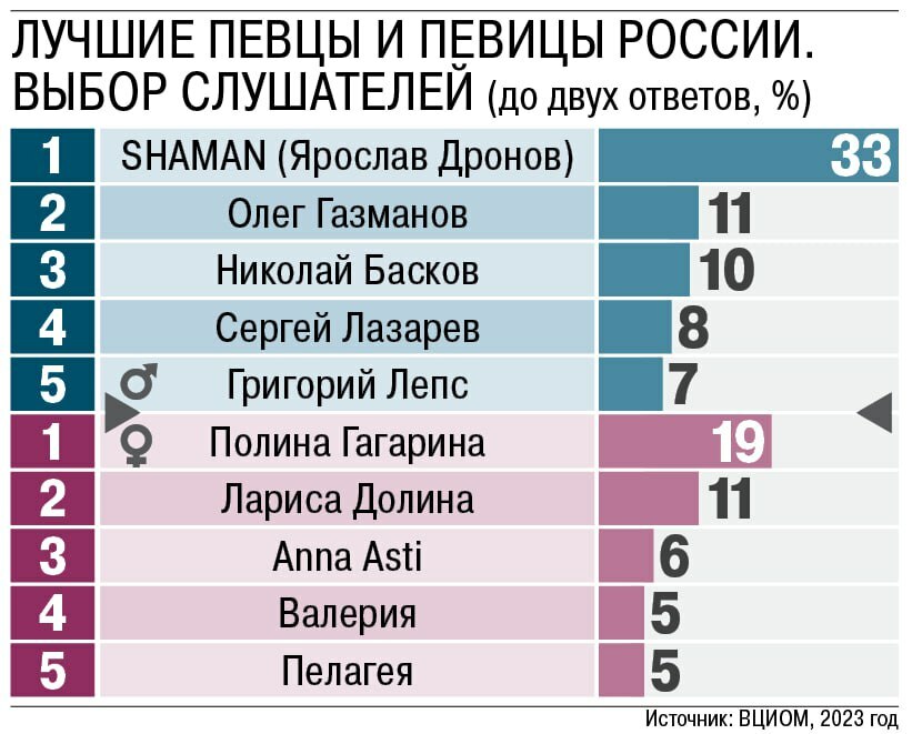 Список популярных артистов последние несколько лет не менялся. По опросу ВЦИОМ, в 2023 и 2022 годах пятерка любимцев публики выглядела так: SHAMAN, Олег Газманов, Николай Басков, Сергей Лазарев, Григорий Лепс, Филипп Киркоров. Причем рейтинг лидера втрое выше, чем у занявшего второе место исполнителя «Есаула» и «Офицеров». Среди певиц конкуренция ниже, но все же который год на одних и тех же местах: Полина Гагарина, Лариса Долина, Anna Asti, Валерия, Пелагея. Разве что Алла Пугачева в 2023 году вылетела из пятерки: лучшей певицей в открытом опросе ее назвали только четыре процента респондентов.