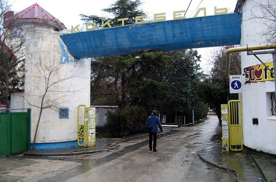 Ворота в бывший Дом творчества писателей «Коктебель» до сих пор выкрашены в старорежимные жёлтый и голубой цвета. Облупившаяся краска лохмотьями свисает с идущего ко дну стилизованного «литературного корабля».