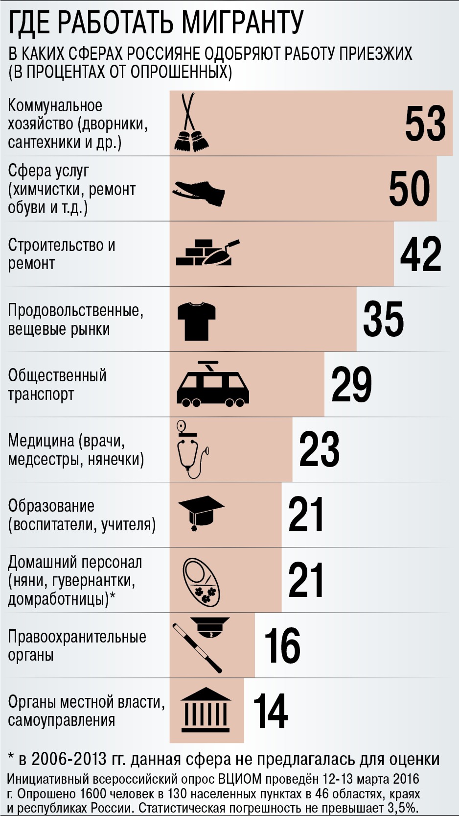 В России в последние годы наиболее активно мигранты трудились в сфере услуг, в коммунальном хозяйстве, в строительстве. Однако в последние годы, согласно опросу ВЦИОМ, проведённому в марте 2016 года, россияне стали более лояльно относиться к присутствию мигрантов в таких отраслях, как образование и медицина. Когда речь идёт о регулярном присутствии работника в семье в качестве гувернантки, няни или домработницы, только пятая часть опрошенных (21 процент) готова поддержать кандидатуру приезжего другой национальности, тогда как против этого выступают 63 процента.