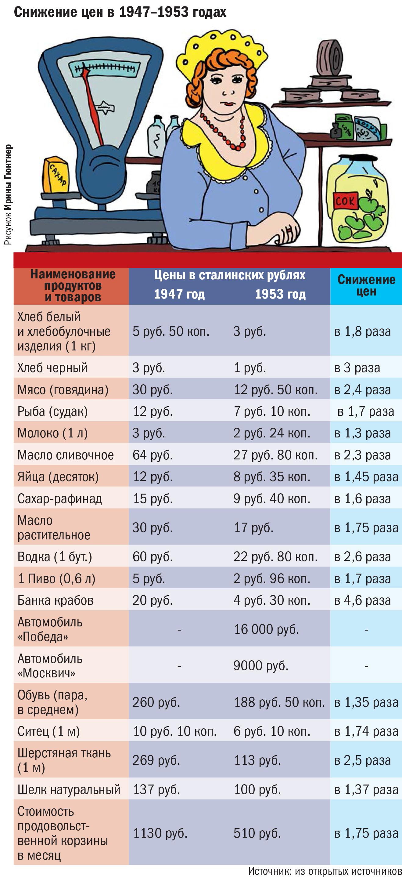Вплоть до 1954 года в газетах того времени публиковались совместные постановления Совмина СССР и ВКП(б) о снижении цен на разнообразные виды товаров вместе с их списком и указанием процентов снижения. Уже к 1950 году цена на буханку хлеба упала в среднем на 26-30 процентов, на мясо — на 24 процента, сливочное масло подешевело на 30 процентов. В 1953 году килограмм белого хлеба можно было купить за 3 рубля, черного — за рубль, килограмм говядины — за 12 рублей 50 копеек, литр молока — за 2 рубля 24 копейки, сливочное масло — за 27 рублей 80 копеек, а растительное — за 17 рублей, десяток яиц стоил 8 рублей 35 копеек.