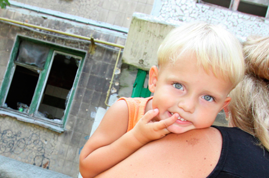 Юный житель пятиэтажного дома в Ясиноватой в Донбассе, пострадавшего в результате обстрела города со стороны украинских силовиков. Фото: РИА Новости/Сергей Аверин
