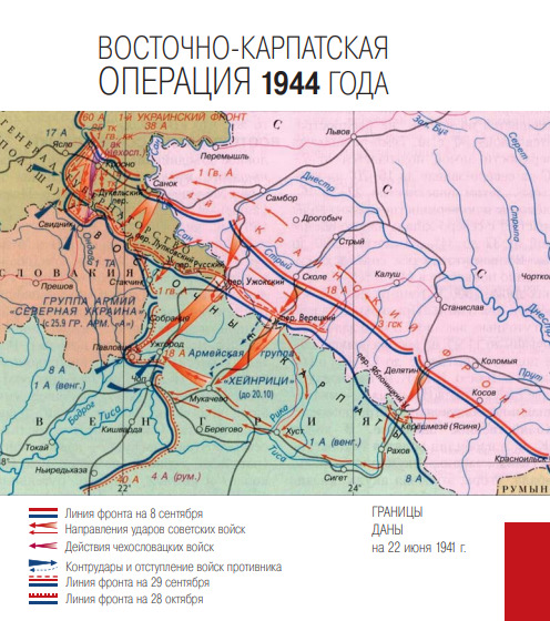 Восточно-Карпатская стратегическая наступательная операция Красной армии завершила освобождение Украины от фашистов, которое длилось больше полутора лет. Фашисты вторглись на ее территорию в первый же день войны — 22 июня 1941 года. 19 сентября советские войска оставили Киев, а к концу осени 1941 года территория Украинской ССР была полностью оккупирована немецко-фашистскими захватчиками — Крым, державшийся до лета 1942 года, тогда входил в состав РСФСР.