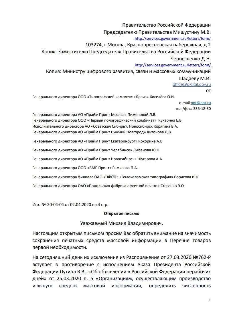 Исключение печатных СМИ из перечня товаров первой необходимости приведёт к остановке всей отрасли, включая работу типографий и издательств, и восстановить систему достоверного информирования населения после эпидемии будет невозможно. С таким предостережением обратились руководители 11 крупных типографических компаний к премьер-министру Михаилу Мишустину, вице-премьеру Дмитрию Чернышенко, который курирует медиасферу, а также к министру цифрового развития, связи и массовых коммуникаций Максуту Шадаеву. «Парламентская газета» получила копию коллективного письма.