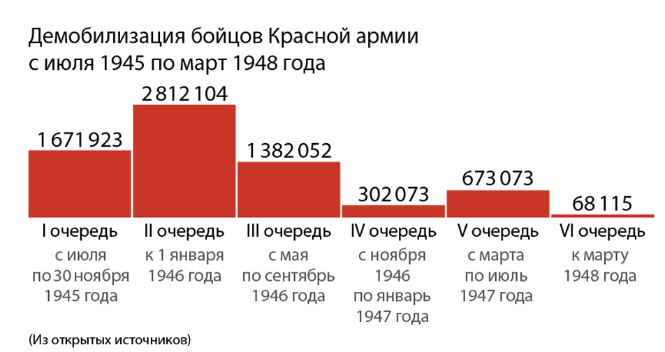 Страна ждала своих героев. Первый воинский эшелон с демобилизованными участниками штурма Берлина отправился из Германии 10 июля 1945 года. А всего с июля по 30 ноября 1945 года было демобилизовано 1 671 923 военнослужащих, в том числе 1 379 139 рядовых и сержантов и 292 784 женщины.