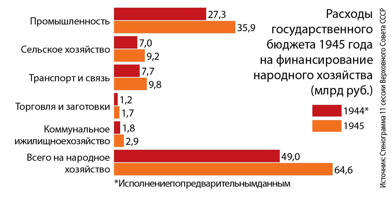 Вот какие цифры прозвучали в докладе народного комиссара финансов СССР Арсения Зверева, представлявшего на сессии проект бюджета: «За три с половиной года войны, то есть по 1944 год включительно, расходы бюджета на финансирование наркоматов обороны и Военно-Морского Флота превысили 420 миллиардов рублей». Если учесть, что предыдущий бюджет на 1944 год планировался по доходам и расходам в сумме 249,6 миллиарда рублей, то можно понять, сколько стоила для СССР война только в финансовом выражении.