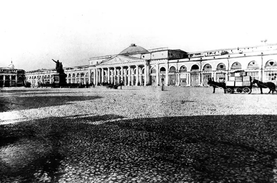 История ГУМа началась со времён правления Ивана III, когда пустое место после пожара на площади заняли торговцы. В XVII веке при Екатерине II на месте обветшавших лавок началось проектирование грандиозного торгового центра в стиле классицизма, где сосредоточивалась почти вся розничная и оптовая торговля Москвы. Проект разработал сам Кваренги, но строительство велось городскими архитекторами. После пожара 1812 года торговые ряды перестроил другой мастер классицизма Осип Бове.