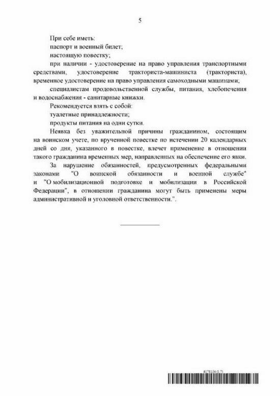 «[Также] за нарушение обязанностей, предусмотренных федеральными законами «О воинской обязанности и военной службе» и «О мобилизационной подготовке и мобилизации», в отношении гражданина могут быть применены меры административной и уголовной ответственности», — говорится в документе.