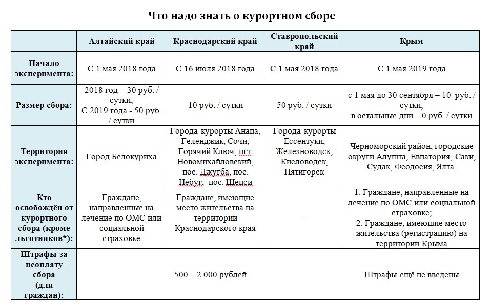 В этом году в России начался эксперимент по сбору платы за пользование курортной инфраструктурой, в народе — курортный сбор. Всего в нём участвуют четыре субъекта — Ставропольский, Алтайский и Краснодарский края и Крым. Первые два региона взимают курортный сбор с 1 мая 2018 года. В Краснодарском крае в связи с чемпионатом мира по футболу старт эксперимента перенесли на 16 июля. В Крыму сборы с курортников начнут взимать с 1 мая 2019 года.