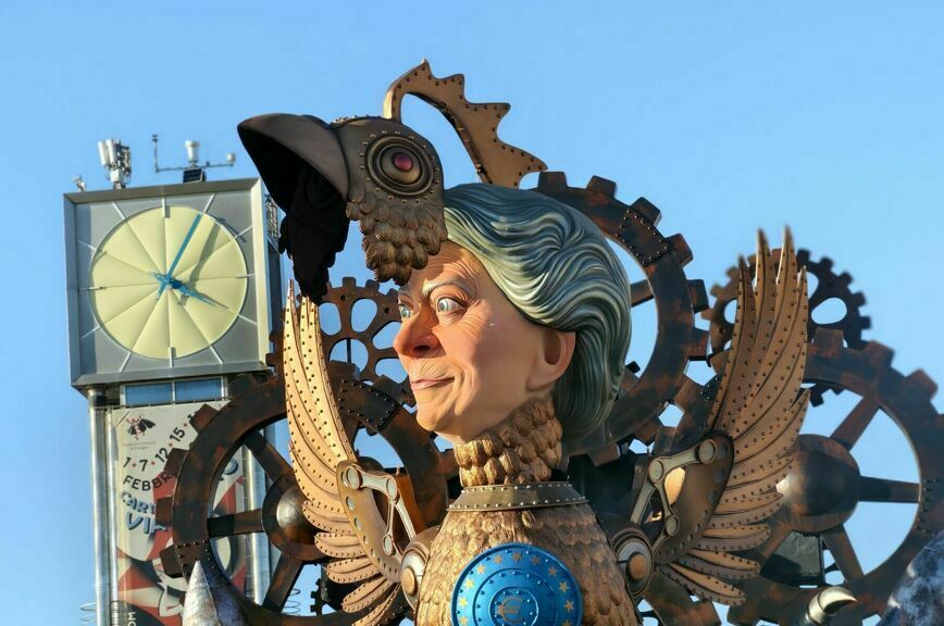 В этом году много внимания было уделено международным проблемам, а открывала парад огромная конструкция с фигурами Владимира Путина, Трампа и Си Цзиньпина. Досталось и европейским бюрократам, на которых итальянцы давно точат зуб. Например, главу Еврокомиссии Урсулу фон дер Ляйен изобразили в образе гигантской роботизированной «курицы, несущей золотые яйца», сидящей на «военном бюджете». Ее яйца не дают жизнь, а являются орудием смерти, как бомбы и пули. А мир, запертый в клетке, беспомощно наблюдает за происходящим.