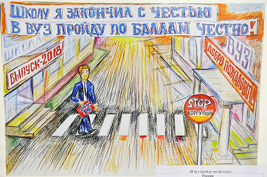 Среди участников — в том числе молодые люди, чьи родственники были осуждены за коррупционные преступления, сообщил Аслан Юсуфов. Надписи на плакатах-номинантах конкурса гласят: «Одна взятка — два преступления!», «За деньги можно купить диплом, но не ум, часы, но не время, врача, но не здоровье».