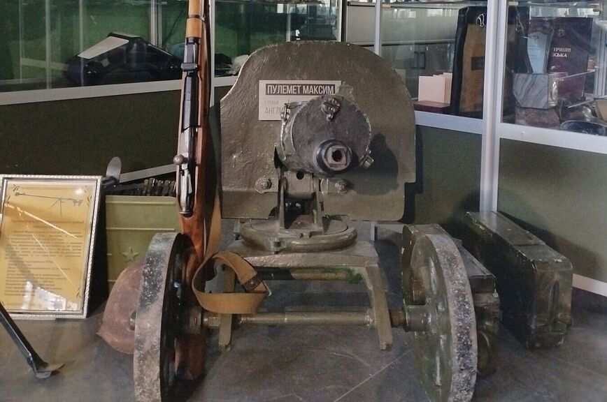 А вот американский пулемет «Браунинг» выпуска тридцатых годов прошлого века. Был установлен на вертолете, который наши сбили в Запорожской области. Напротив «Браунинга» — легендарный «Максим». Его тоже до сих пор нет-нет, да и можно встретить на фронтах СВО.