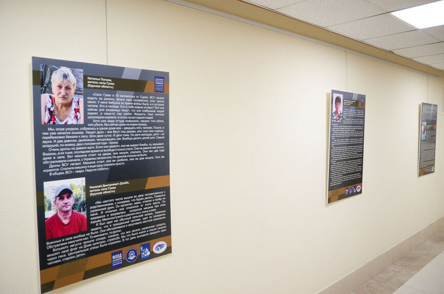 Со стендов на посетителей смотрят лица простых людей, жителей, переживших вторжение украинских националистов в Курскую область в августе 2024 года. Рядом с фото — текст рассказанных ими историй.