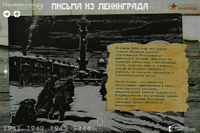 В проекте «Письма из Ленинграда» с 8 сентября 2023 года до 27 января 2024 года каждую неделю публикуются послания, которые писали люди из осажденного города своим родным и знакомым, и ответы на них с фронта и из эвакуации. Эта рубрика выходит в каждом печатном выпуске «Парламентской газеты», а также в специальном разделе на сайте ПисьмаИзЛенинграда.рф и специально созданных для этого проекта каналах в Telegram и на «Дзене».