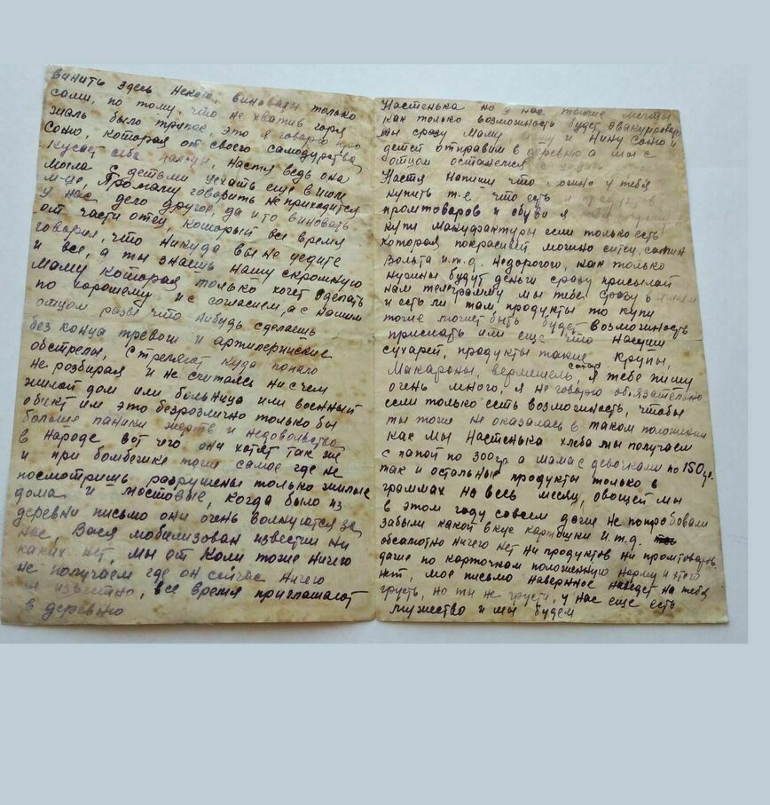 Первое — письмо Александры Баушевой, написанное сестре из блокадного города 19 ноября 1941 года. В нем есть такие строки: «Настенька, хлеба мы получаем с папой по 300 гр., а мама с девочками по 150 гр., так и остальные продукты только в граммах на весь месяц… ». Авторы поясняют, что на следующий день, 20 ноября, в Ленинграде произошло пятое снижение норм выдачи хлеба: по 250 граммов на рабочую карточку и по 125 граммов всем остальным.