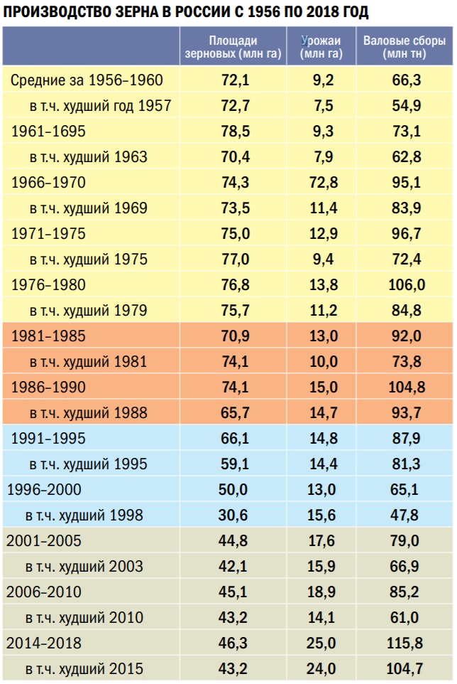 Приведенные данные позволяют наглядно оценить за 60-летний период развитие зернового хозяйства России, его зависимость от природных условий, когда урожаи и валовые сборы в пятилетний период на 20-30 и более процентов колеблются от средних показателей. Это необходимо учитывать при формировании нашей аграрной политики. Данные наглядно показывают, что попытки в 60-70-е годы решить зерновую проблему за счет увеличения площадей не дали устойчивых результатов. Устойчивое увеличение производства зерна должно решаться комплексно, используя все факторы роста.