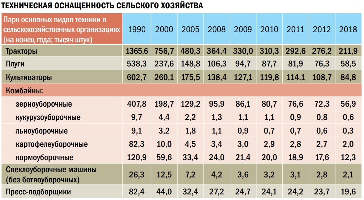 К сожалению, положение не меняется. Техническое вооружение сельскохозяйственных организаций снижается. За 2011-2016 годы приобретено техники меньше, чем списано в связи с выработкой полного срока эксплуатации тракторов на 49,4 тысячи штук, зерноуборочных комбайнов — на 16,7 тысячи и кормоуборочных комбайнов — на 7,8 тысячи единиц.