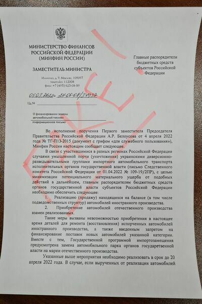 В «документе» якобы за подписью замминистра финансов РФ Алексея Лаврова данное требование объясняется «участившимися случаями умышленной порчи украинскими диверсионно-разведывательными группами импортного автомобильного транспорта исполнительных органов государственной власти». Это нужно, уверяют авторы письма, с целью «минимизации потенциального материального ущерба от подобных действий в дальнейшем».