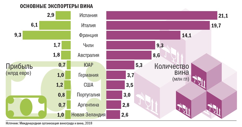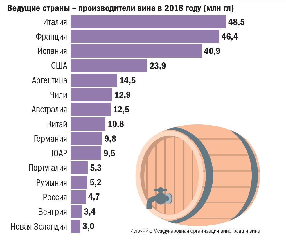 Как уже отмечалось, Россия существенно отстает от ведущих стран-производителей вина по количеству и выращиваемого винограда, и произведенного вина. Так, по данным Международной организации винограда и вина за 2018 год, в РФ было произведено 4,7 миллиона гектолитров напитков. Италия за тот же год произвела порядка 48,5 миллиона гектолитров, Франция — 46,4, Испания — 40,9. При этом по потреблению вина наша страна входит десятку ведущих стран, опережая многих ключевых винопроизводителей. По данным 2018 года, россияне заняли седьмое место в мире по потреблению, выпив порядка 11,9 миллиона гектолитров вина. Мы уступаем США (33 миллиона), Франции (26,8), Италии (22,4), Германии (20), Китаю (18) и Великобритании (12,4)…