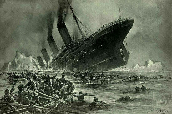 На пятый день пути, 14 апреля, капитан корабля Эдвард Джон Смит получил предупреждения об айсбергах в районе маршрута следования. Однако корабль продолжил идти прежним курсом. Около полуночи вперёдсмотрящие заметили ледяную гору, но, несмотря на все усилия команды, судну не удалось быстро изменить курс. «Титаник» напоролся на айсберг, который прорезал шесть из 16 водонепроницаемых отсеков судна.