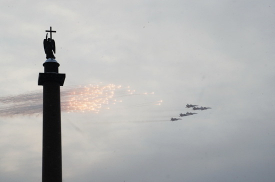 Несколько рот были одеты в форму времен войны и несли винтовки и автоматы, состоявшие на вооружении Красной армии в 1941-45 годах. Помогли и реконструкторы, они вывели на Дворцовую площадь автомобили, броневики, мотоциклы, гаубицы, участвовавшие в обороне Ленинграда. Открывал парад легендарный танк Т-34-85, а закрывала батарея современных ракет „Искандер“ и С-400. А в самом финале в небе появилась авиагруппа »Стрижи», прилетевшая из подмосковной Кубинки. Ее участие в военном шоу оказалось сюрпризом: ни в одной программе выступление воздушных асов не значилось.