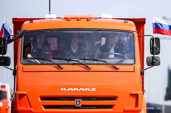 Днём во вторник глава государства открыл движение по Крымскому мосту. Глава государства сел за руль КамАЗа со словами «Поехали».