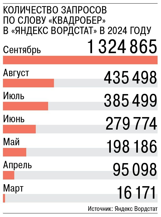 Ранее «Парламентская газета» рассказывала о взрывном росте популярности квадроберов в Сети. Так, если в октябре 2022 года статистический сервис «Яндекс Вордстат» зафиксировал всего 43 запроса по этому слову, то уже в сентябре 2024 этот показатель перевалил за миллион. Популярность квадроберов всего за несколько месяцев практически сравнялась с популярностью косплееров и фурри, хотя этим движениям уже не один десяток лет — и, судя по всему, это еще не предел.
